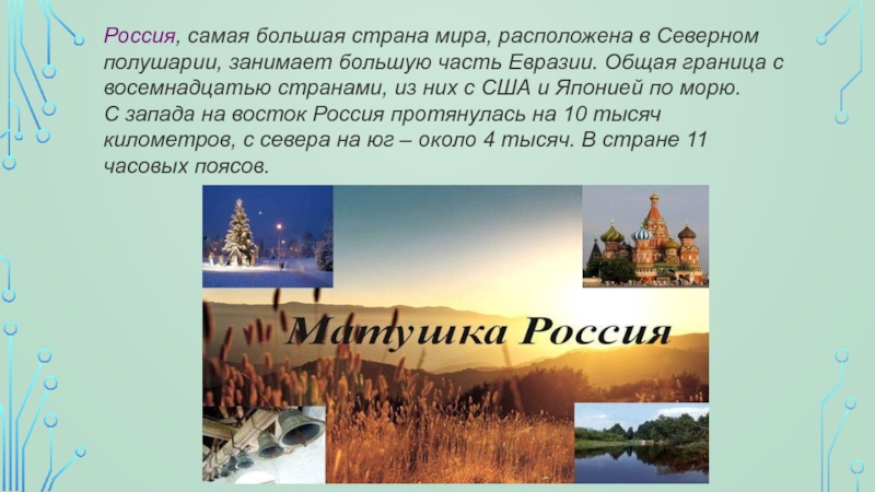 Слайд 4Россия, самая большая страна мира, расположена в Северном полушарии, занимает большую