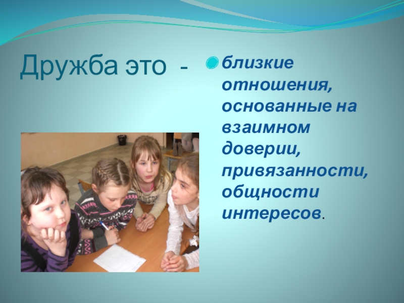 Дружба это -близкие отношения, основанные на взаимном доверии, привязанности, общности интересов.