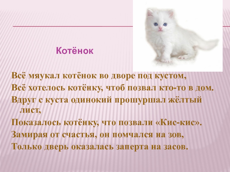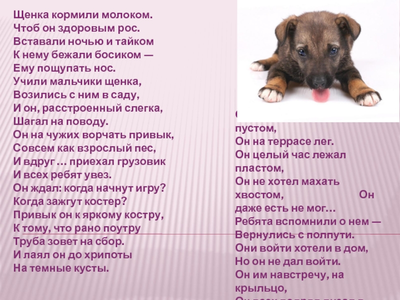 Он был один в саду пустом, Он на террасе лег. Он целый час лежал пластом, Он не хотел махать хвостом, Он даже есть не мог… Ребята вспомнили о нем — Вернулись с полпути. Они войти хотели в дом, Но он не дал войти. Он им навстречу, на крыльцо, Он всех подряд лизал в лицо. Его ласкали малыши, И лаял он от всей души.
