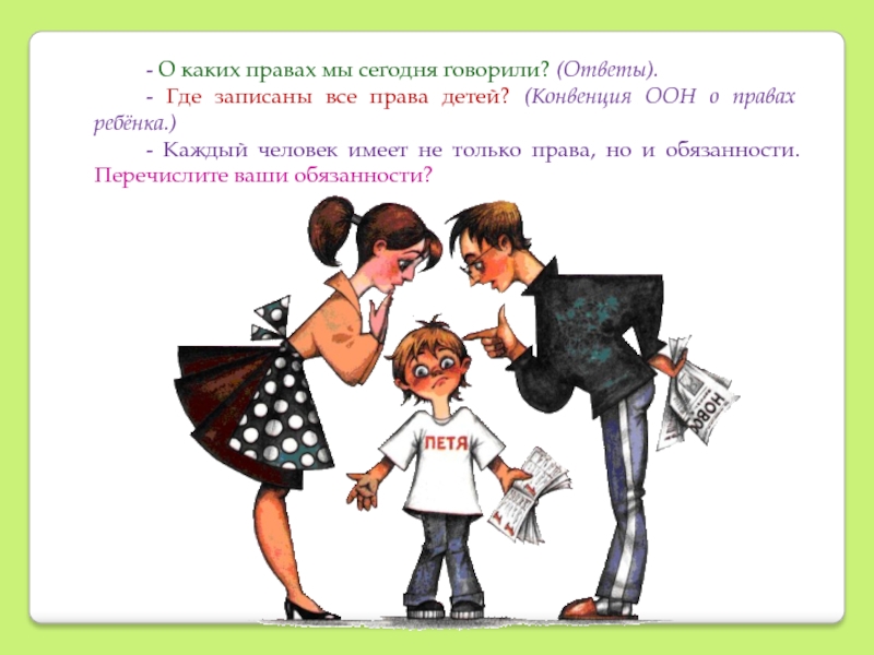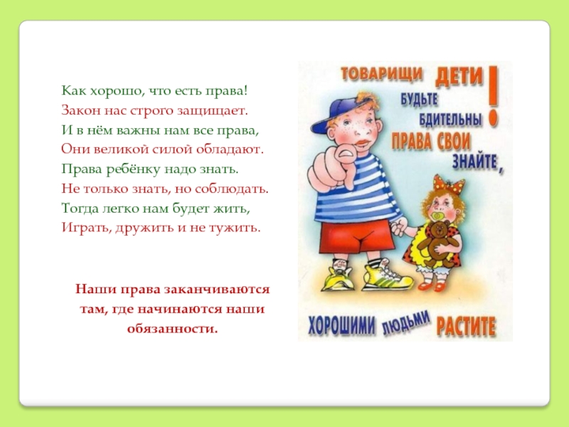 Но нельзя забывать о том, что у вас есть, не только права, но и обязанности. Вы должны помогать своим родителям, а еще обязаны слушаться своих родителей.