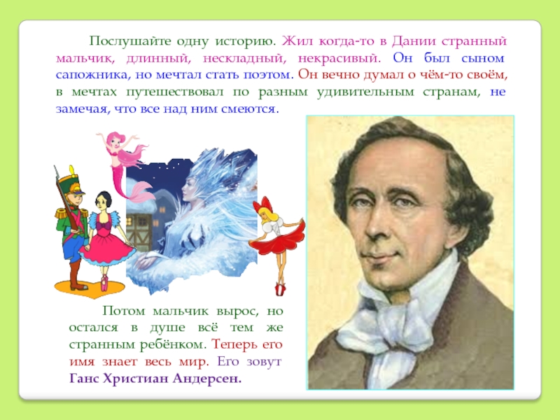 Потом мальчик вырос, но остался в душе всё тем же странным ребёнком. Теперь его имя знает весь мир. Его зовут Ганс Христиан Андерсен.
