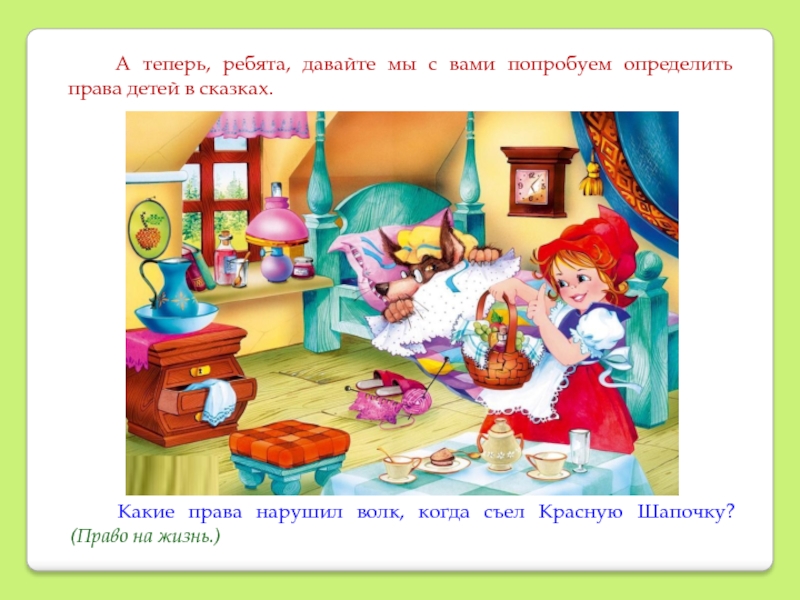 Какие права нарушил волк, когда съел Красную Шапочку? (Право на жизнь.)