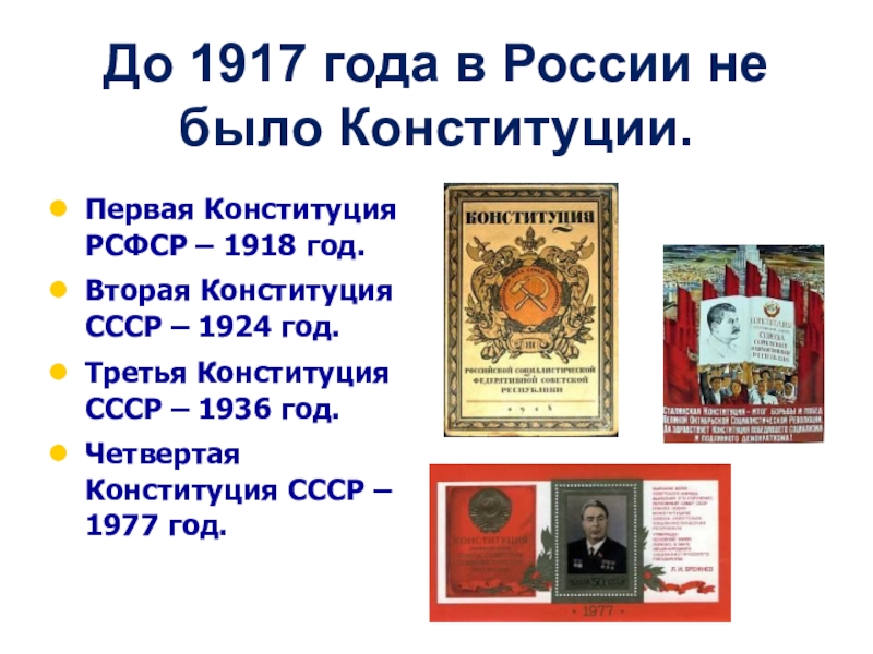 До 1917 года в России не было Конституции.Первая Конституция РСФСР – 1918 год.Вторая Конституция СССР – 1924