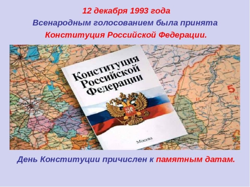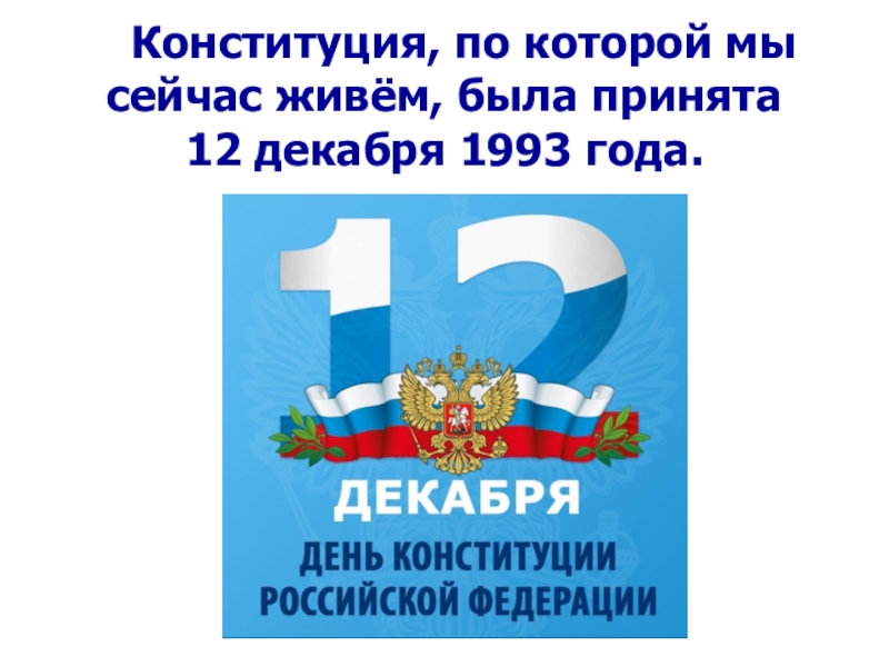 Слайд 6 Конституция, по которой мы сейчас живём, была принята 12 декабря