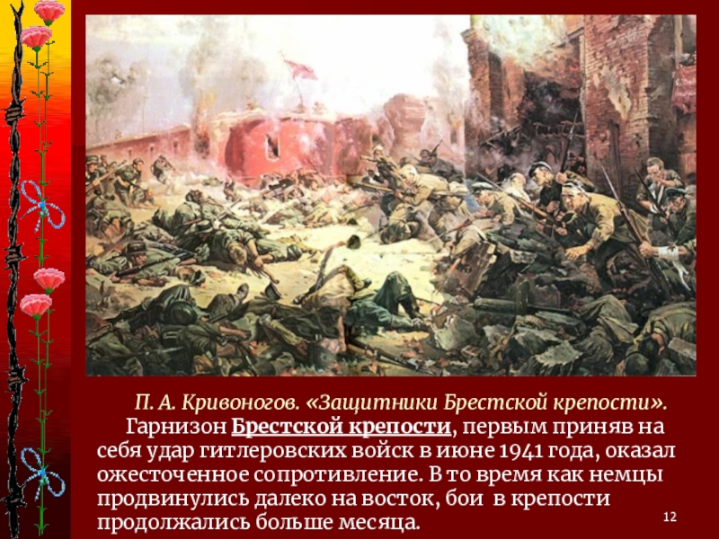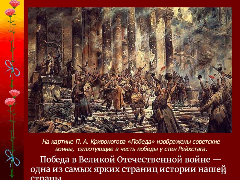 На картине П. А. Кривоногова «Победа» изображены советские воины, салютующие в честь победы у стен Рейхстага.