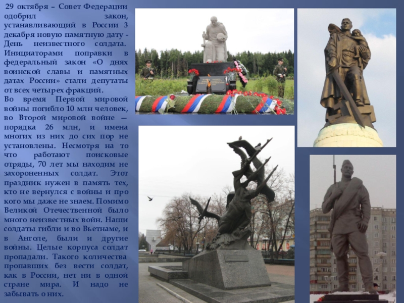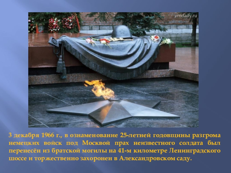 Память о тех, кто остался Неизвестным солдатом, на чьих могилах нет имен, хранит Вечный огонь. Он горит на Могиле Неизвестного солдата у Кремлевской стены и у сотен мемориалов по всей России. Подвиг защитников Отечества бессмертен, и символ нашей Вечной памяти – огненные журавли у самого сердца.