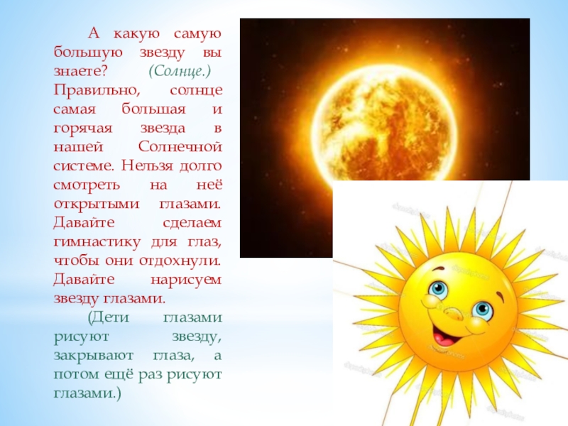 большая и горячая звезда в нашей Солнечной системе. Нельзя долго смотреть на неё открытыми глазами. Давайте сделаем гимнастику для глаз, чтобы они отдохнули. Давайте нарисуем звезду глазами.