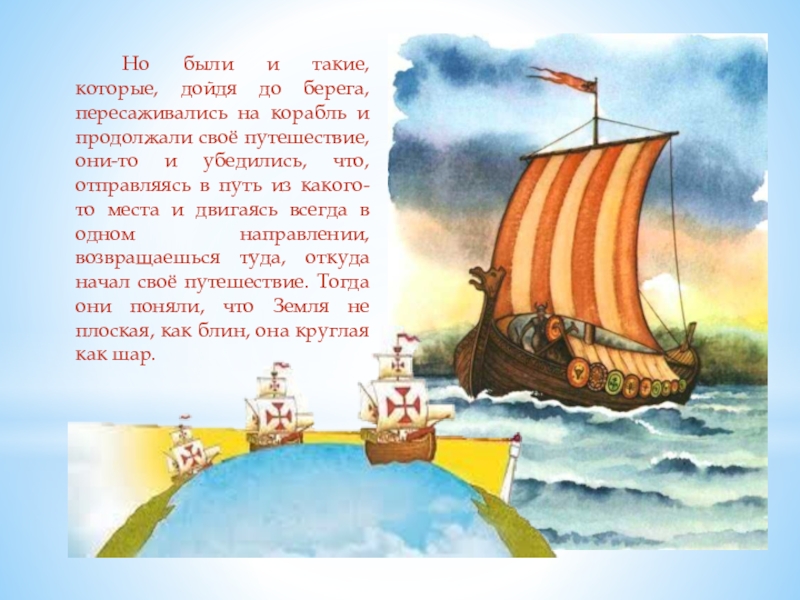 и продолжали своё путешествие, они-то и убедились, что, отправляясь в путь из какого-то места и двигаясь всегда в одном направлении, возвращаешься туда, откуда начал своё путешествие. Тогда они поняли, что Земля не плоская, как блин, она круглая как шар.