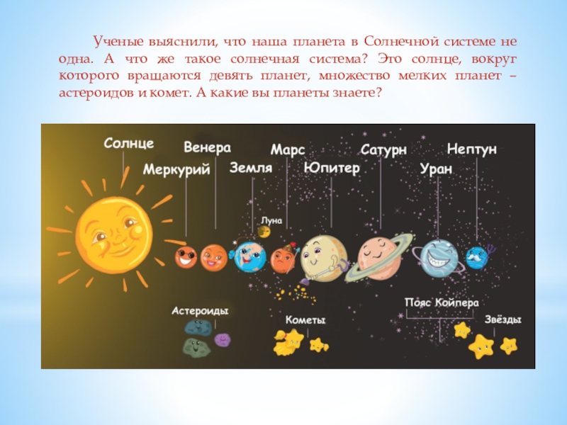 что же такое солнечная система? Это солнце, вокруг которого вращаются девять планет, множество мелких планет – астероидов и комет. А какие вы планеты знаете?