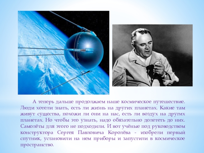 ли жизнь на других планетах. Какие там живут существа, похожи ли они на нас, есть ли воздух на других планетах. Но чтобы это узнать, надо обязательно долететь до них. Самолёты для этого не подходили. И вот учёные под руководством конструктора Сергея Павловича Королёва - изобрели первый спутник, установили на нем приборы и запустили в космическое пространство.