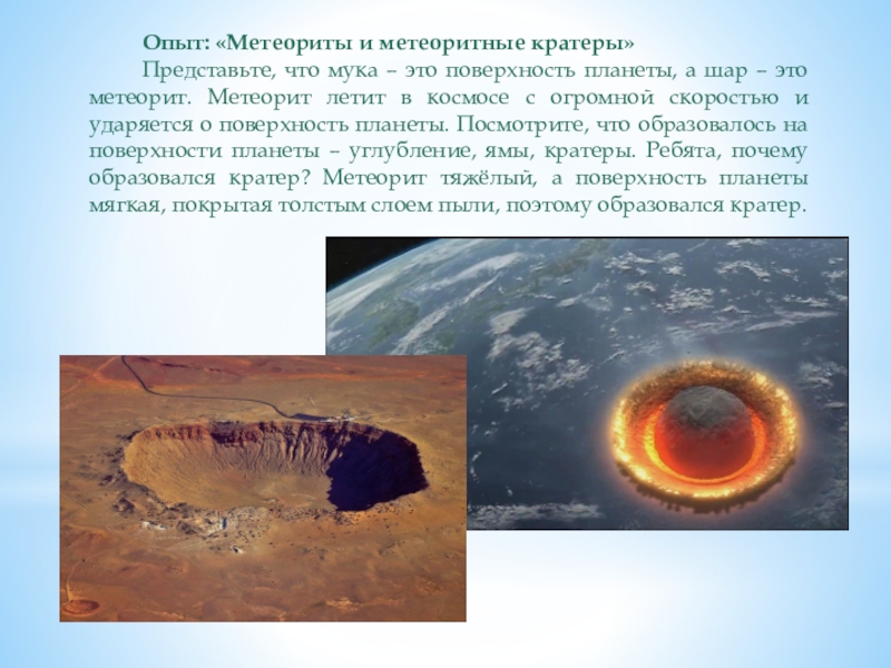 планеты, а шар – это метеорит. Метеорит летит в космосе с огромной скоростью и ударяется о поверхность планеты. Посмотрите, что образовалось на поверхности планеты – углубление, ямы, кратеры. Ребята, почему образовался кратер? Метеорит тяжёлый, а поверхность планеты мягкая, покрытая толстым слоем пыли, поэтому образовался кратер.