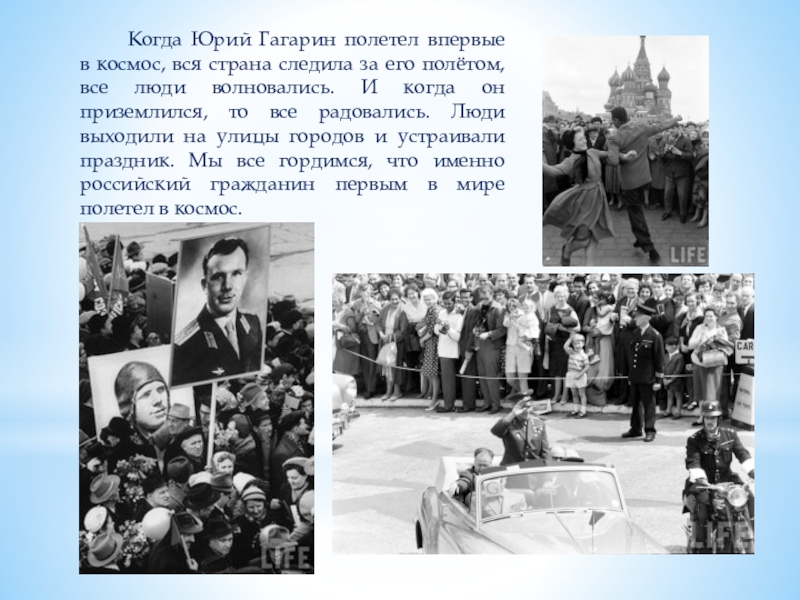 его полётом, все люди волновались. И когда он приземлился, то все радовались. Люди выходили на улицы городов и устраивали праздник. Мы все гордимся, что именно российский гражданин первым в мире полетел в космос.
