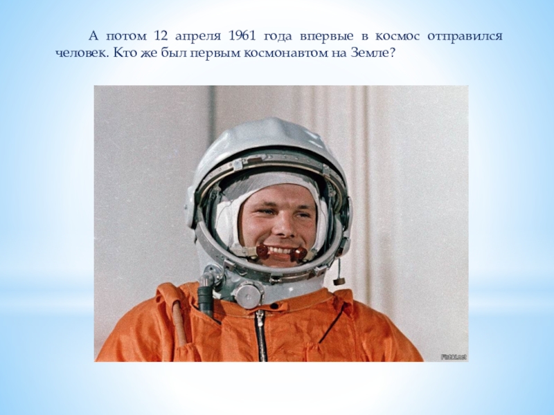 Слайд 20А потом 12 апреля 1961 года впервые в космос отправился человек.