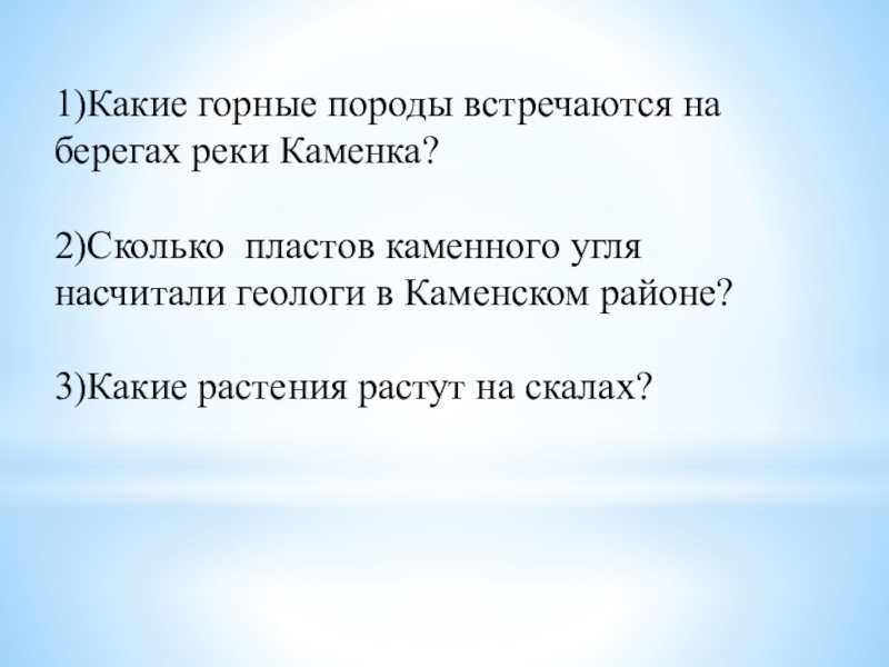 1)Какие горные породы встречаются на берегах реки Каменка? 2)Сколько пластов каменного угля насчитали геологи в Каменском районе?