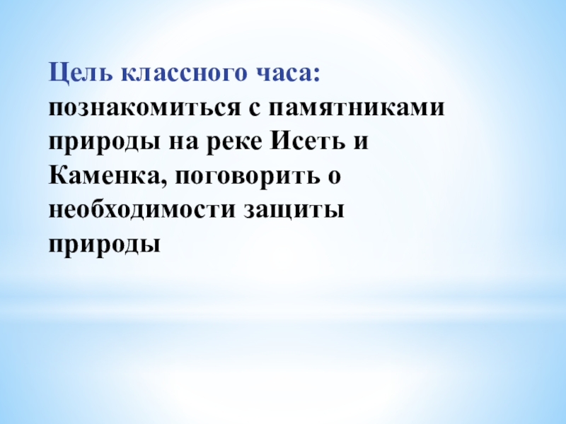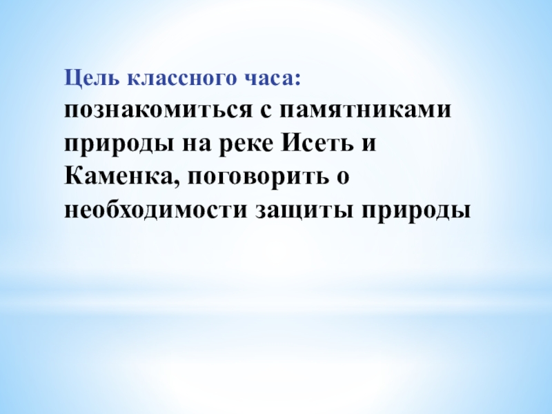 Слайд 17Цель классного часа: познакомиться с памятниками природы на реке Исеть и