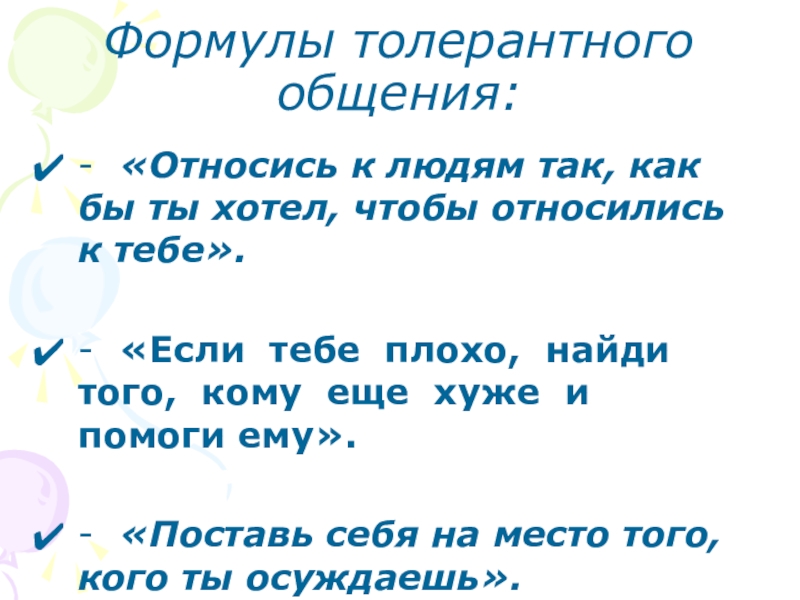 Формулы толерантного общения: - «Относись к людям так, как бы ты хотел, чтобы относились к тебе». -