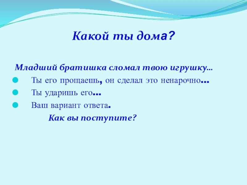 Какой ты дома?Младший братишка сломал твою игрушку…Ты его прощаешь, он сделал это ненарочно…Ты ударишь его…Ваш вариант ответа.