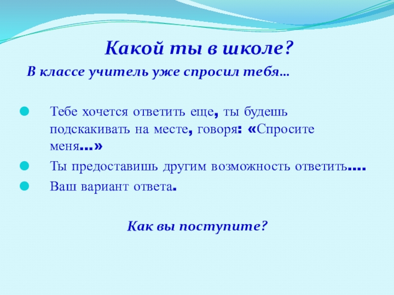 Какой ты в школе? В классе учитель уже спросил тебя…Тебе хочется ответить еще, ты будешь подскакивать