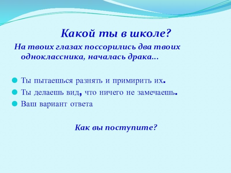 Какой ты в школе?На твоих глазах поссорились два твоих одноклассника, началась драка...Ты пытаешься разнять и примирить их.