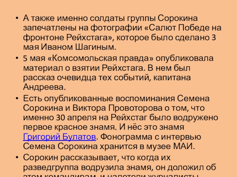 «Лейтенант Сорокин вместе с рядовым Григорием Булатовым 30 апреля под ураганным огнем немцев взобрались на крышу Рейхстага и водрузили знамя».