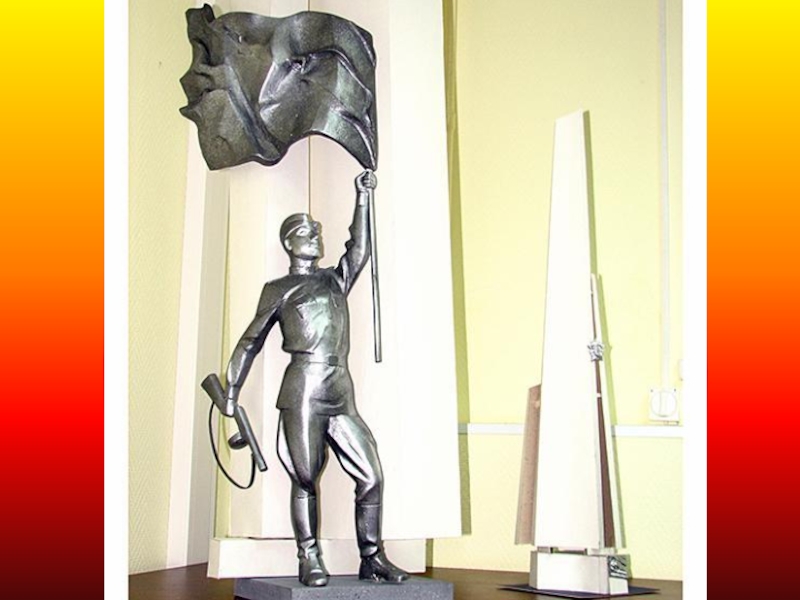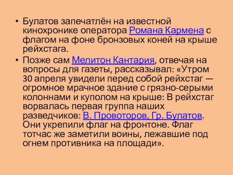 Слайд 6Булатов запечатлён на известной кинохронике оператора Романа Кармена с флагом на фоне бронзовых