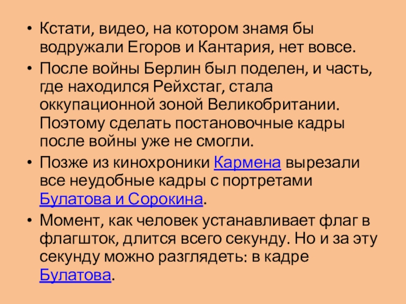 Слайд 12Кстати, видео, на котором знамя бы водружали Егоров и Кантария, нет