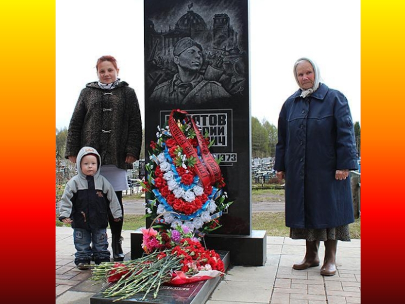 Парня приведут на кладбище города Слободского, где в 2005 году был возведен памятник Григорию Булатову, и покажут портрет прадеда, который выгравирован на массивной гранитной плите - портрет солдата на фоне Рейхстага.