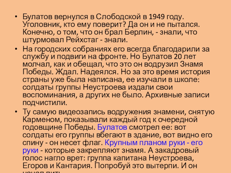 На городских собраниях его всегда благодарили за службу и подвиги на фронте. Но Булатов 20 лет молчал, как и обещал, что это он водрузил Знамя Победы. Ждал. Надеялся. Но за это время история страны уже была написана, ее изучали в школе: солдаты группы Неустроева издали свои воспоминания, а других не было. Архивные записи подчистили.