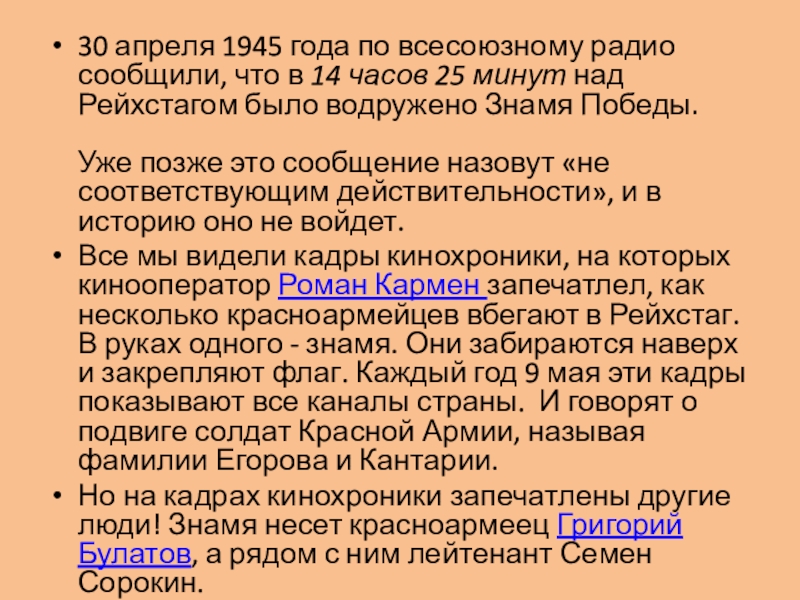 Слайд 430 апреля 1945 года по всесоюзному радио сообщили, что в 14 часов