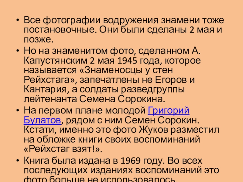 Слайд 14Все фотографии водружения знамени тоже постановочные. Они были сделаны 2 мая