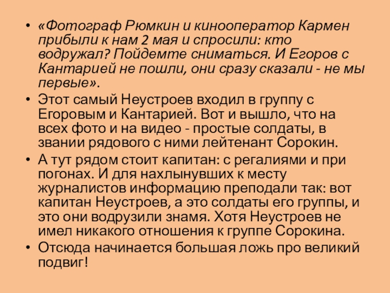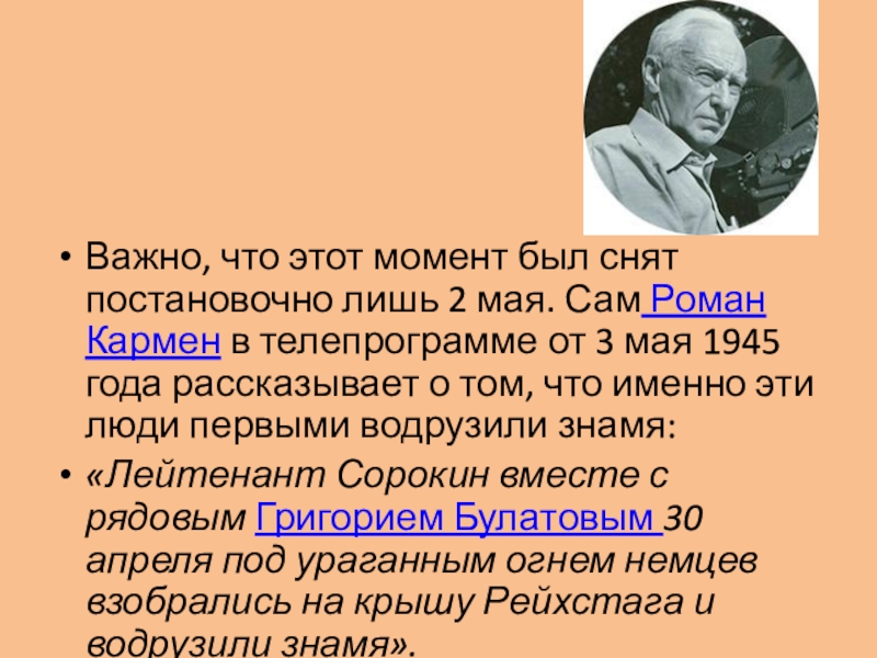 Слайд 10Важно, что этот момент был снят постановочно лишь 2 мая. Сам