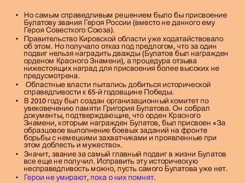 Слайд 29Но самым справедливым решением было бы присвоение Булатову звания Героя России