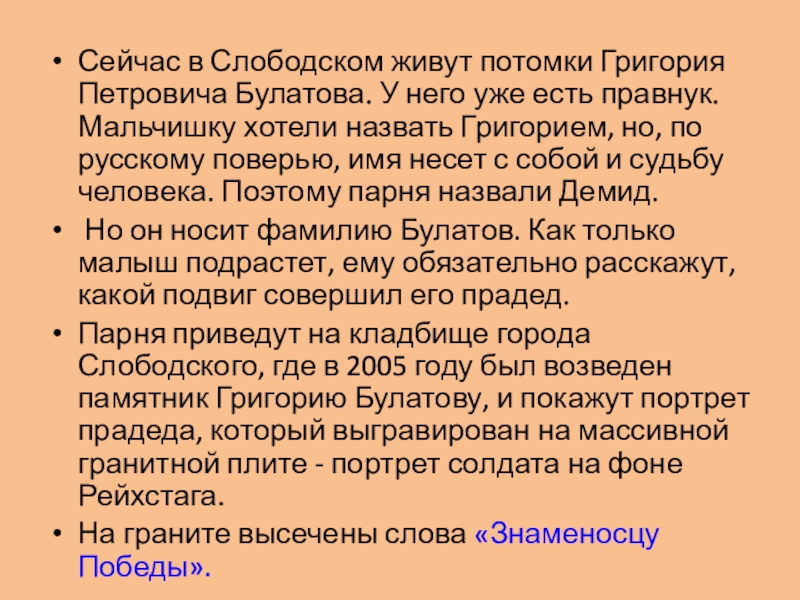 Слайд 23Сейчас в Слободском живут потомки Григория Петровича Булатова. У него уже