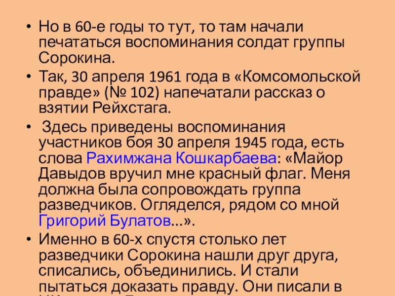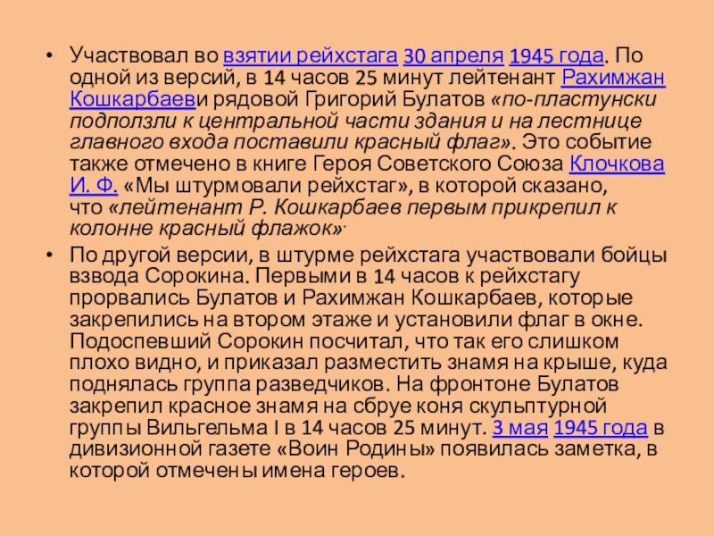 Здесь приведены воспоминания участников боя 30 апреля 1945 года, есть слова Рахимжана Кошкарбаева: «Майор Давыдов вручил мне красный флаг. Меня должна была сопровождать группа разведчиков. Огляделся, рядом со мной Григорий Булатов...».