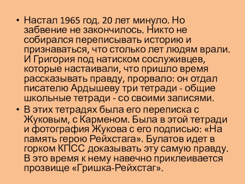 В этих тетрадях была его переписка с Жуковым, с Карменом. Была в этой тетради и фотография Жукова с его подписью: «На память герою Рейхстага». Булатов идет в горком КПСС доказывать эту самую правду. В это время к нему навечно приклеивается прозвище «Гришка-Рейхстаг».