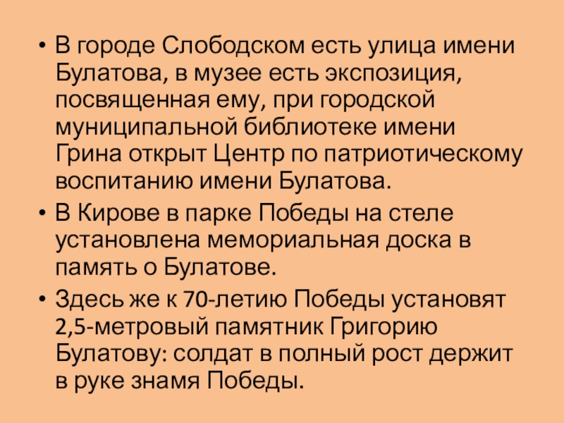 Слайд 25В городе Слободском есть улица имени Булатова, в музее есть экспозиция,