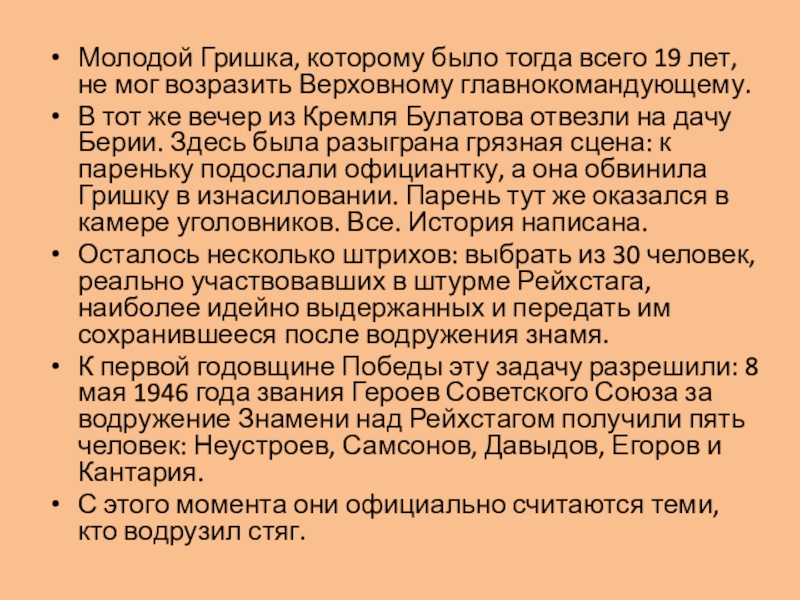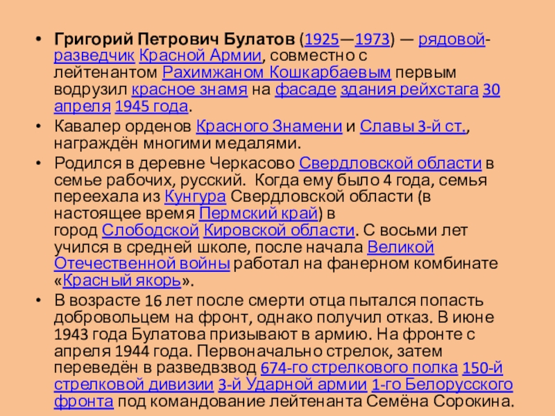 Слайд 2Григорий Петрович Булатов (1925—1973) — рядовой-разведчик Красной Армии, совместно с лейтенантом Рахимжаном Кошкарбаевым первым водрузил красное знамя на фасаде здания рейхстага 30