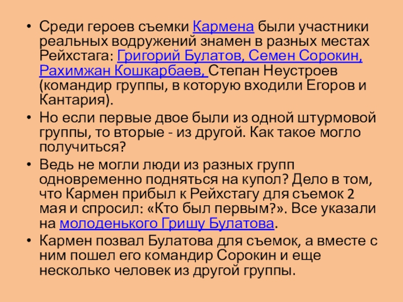 Ведь не могли люди из разных групп одновременно подняться на купол? Дело в том, что Кармен прибыл к Рейхстагу для съемок 2 мая и спросил: «Кто был первым?». Все указали на молоденького Гришу Булатова.