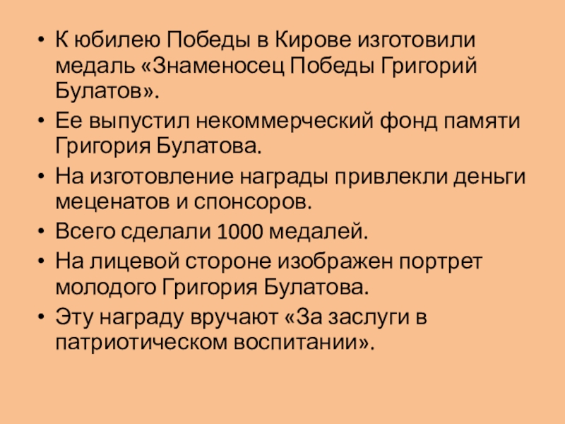 Слайд 27К юбилею Победы в Кирове изготовили медаль «Знаменосец Победы Григорий Булатов».