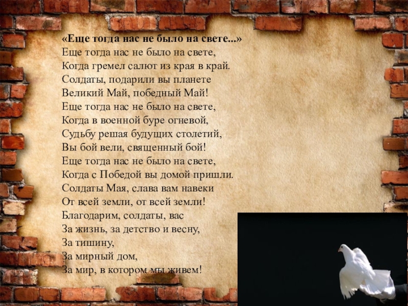 «Еще тогда нас не было на свете...»Еще тогда нас не было на свете,Когда гремел салют из края в край.Солдаты, подарили вы планетеВеликий Май, победный Май!Еще тогда нас не было на свете,Когда в военной буре огневой,Судьбу решая