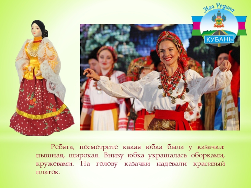 Слайд 21Ребята, посмотрите какая юбка была у казачки: пышная, широкая. Внизу юбка