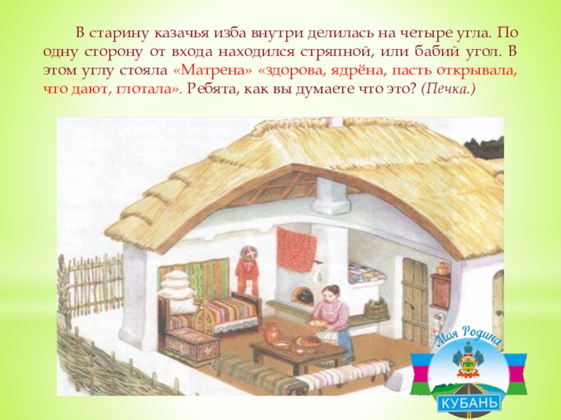 Слайд 6В старину казачья изба внутри делилась на четыре угла. По одну