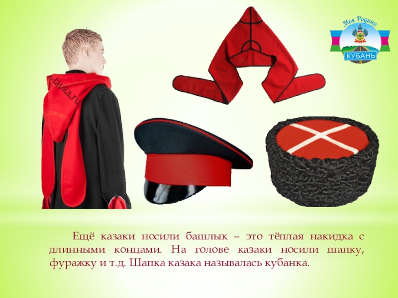Слайд 17Ещё казаки носили башлык – это тёплая накидка с длинными концами.