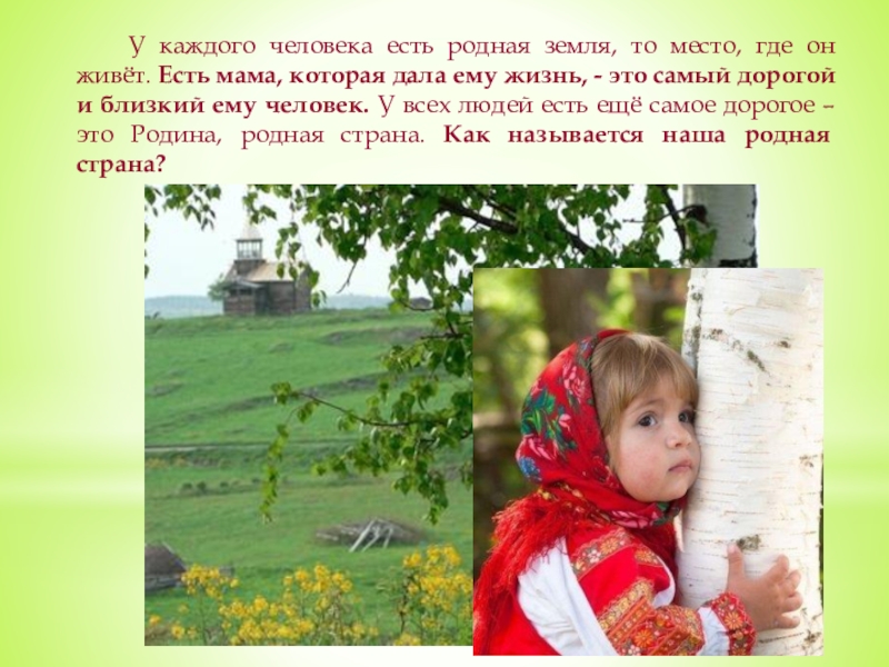 Есть мама, которая дала ему жизнь, - это самый дорогой и близкий ему человек. У всех людей есть ещё самое дорогое – это Родина, родная страна. Как называется наша родная страна?