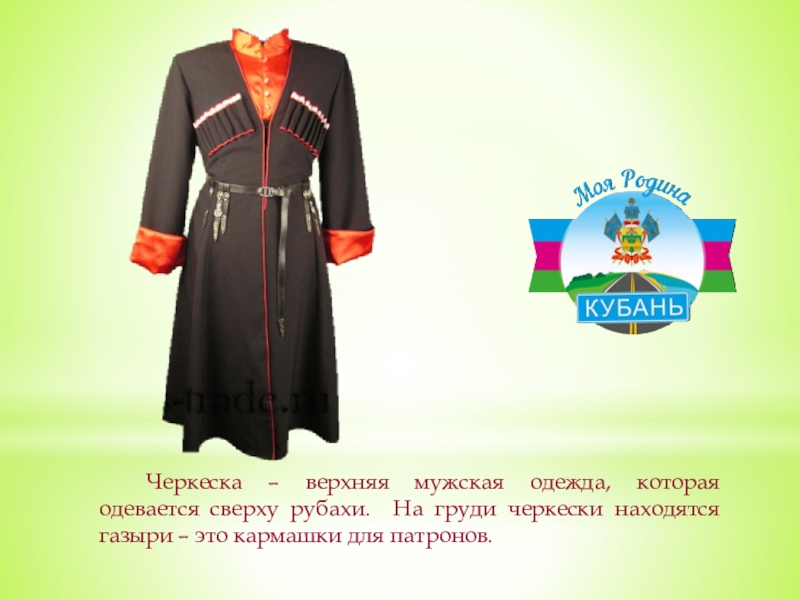 Слайд 15Черкеска – верхняя мужская одежда, которая одевается сверху рубахи. На груди
