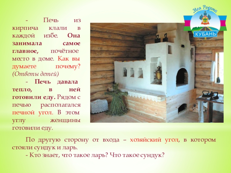 сторону от входа находился стряпной, или бабий угол. В этом углу стояла «Матрена» «здорова, ядрёна, пасть открывала, что дают, глотала». Ребята, как вы думаете что это? (Печка.)