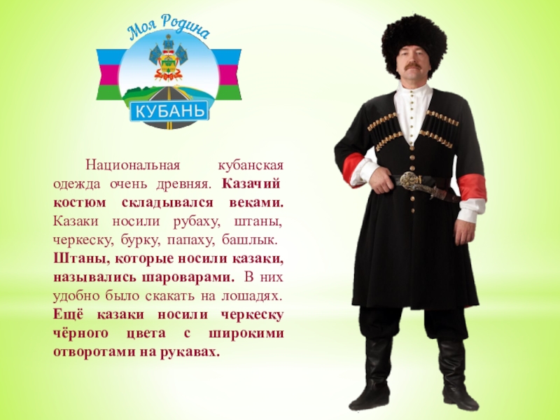 Слайд 14Национальная кубанская одежда очень древняя. Казачий костюм складывался веками. Казаки носили