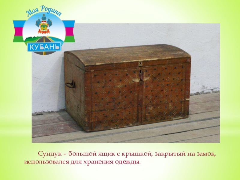 Слайд 9Сундук – большой ящик с крышкой, закрытый на замок, использовался для