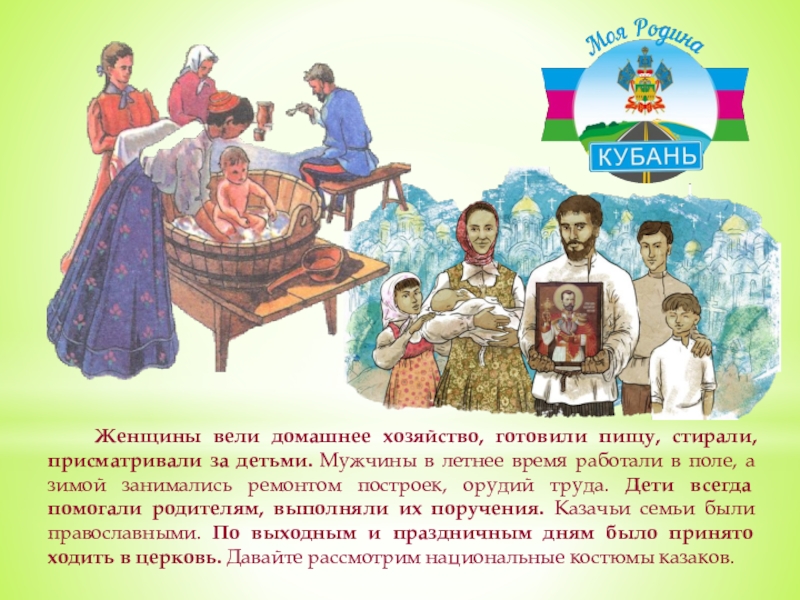 в летнее время работали в поле, а зимой занимались ремонтом построек, орудий труда. Дети всегда помогали родителям, выполняли их поручения. Казачьи семьи были православными. По выходным и праздничным дням было принято ходить в церковь. Давайте рассмотрим национальные костюмы казаков.