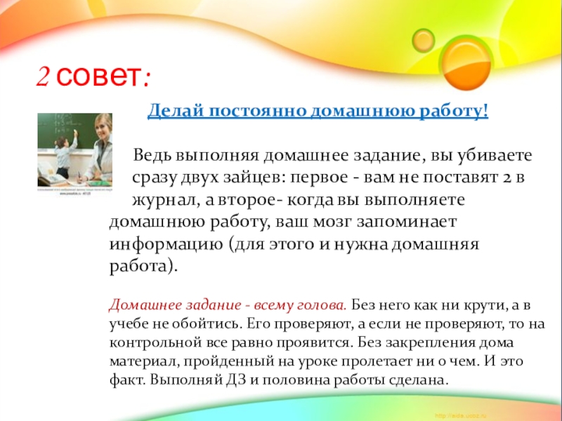 Домашнее задание - всему голова. Без него как ни крути, а в учебе не обойтись. Его проверяют, а если не проверяют, то на контрольной все равно проявится. Без закрепления дома материал, пройденный на уроке пролетает ни о чем. И это факт. Выполняй ДЗ и половина работы сделана.